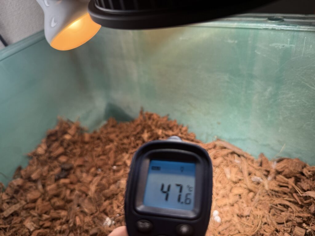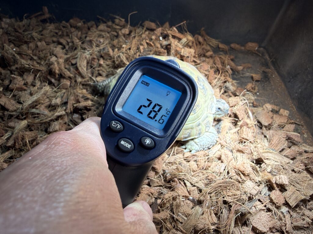 たとえば、飼っているリクガメの食欲がなくなってしまったとします。甲羅の温度を測ってみたら29℃でした。このとき、元気に餌を食べていたときの甲羅の温度は33℃だったという記録(記憶でもいいです)があれば、「ひょっとして寒いのでは?」と推測することができます。そのうえで、クールスポットの温度は元気だったときと同じだけれど、バスキングスポットの温度は元気だったときよりも低いということがわかれば、「バスキングランプを大きくすればよいのでは?」という解決案を導き出すことができます。ご自身では判断できなかったとしても、そのデータがあれば、我々がアドバイスしやすくなります。