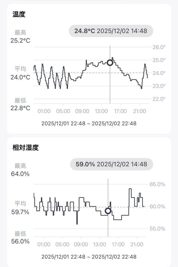 BluetoothやWi-Fiを介してスマホと連携でき、温度・湿度の変化をリアルタイムにスマホに届けてくれます。外出先でも、スマホアプリから温度や湿度が確認できるので、ケージ内の環境を細やかに把握することができます。さらに、たいていは数年分のデータをクラウドに保存しておけるので、先月に比べてどうか、去年と比べてどうか、といった比較もすることができます。生体が体調を崩したとき、何がいけないのか考えるためにとても有用なデータを残してくれる装置です。