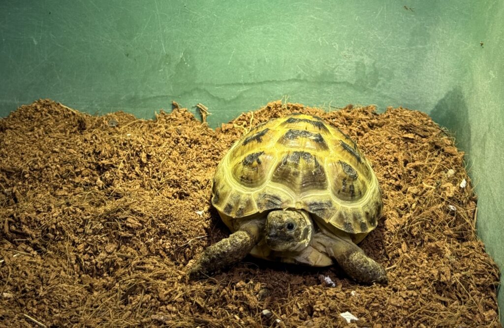 なお、これだけでは幼いリクガメにはつらいことがあるので、さらに素焼きのシェルターを置いたり、霧吹きしたりして、湿度の高い場所、時間を作ることで乾燥を防いでいきます。